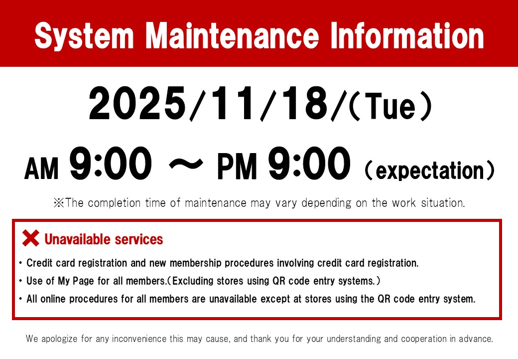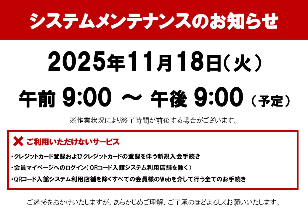 つきましては、システムメンテナンス中の会員マイページの一部サービスがご利用いただけません。